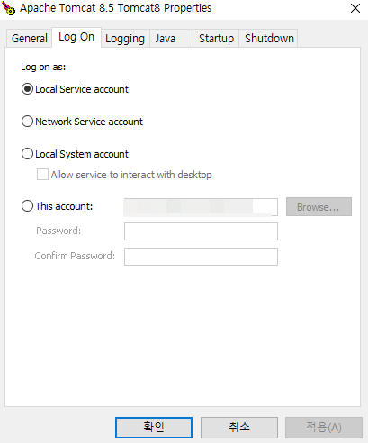 톰캣 서비스에서 계정을 확인합니다.(혹은 os계정)